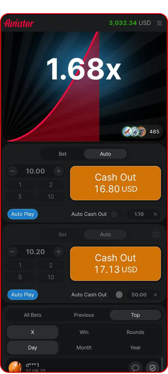 The multiplier starts at 1x when the plane launches. It climbs in real time on your screen. You need to cash out before the crash happens. Hit the cash-out button to collect your bet times the current multiplier.